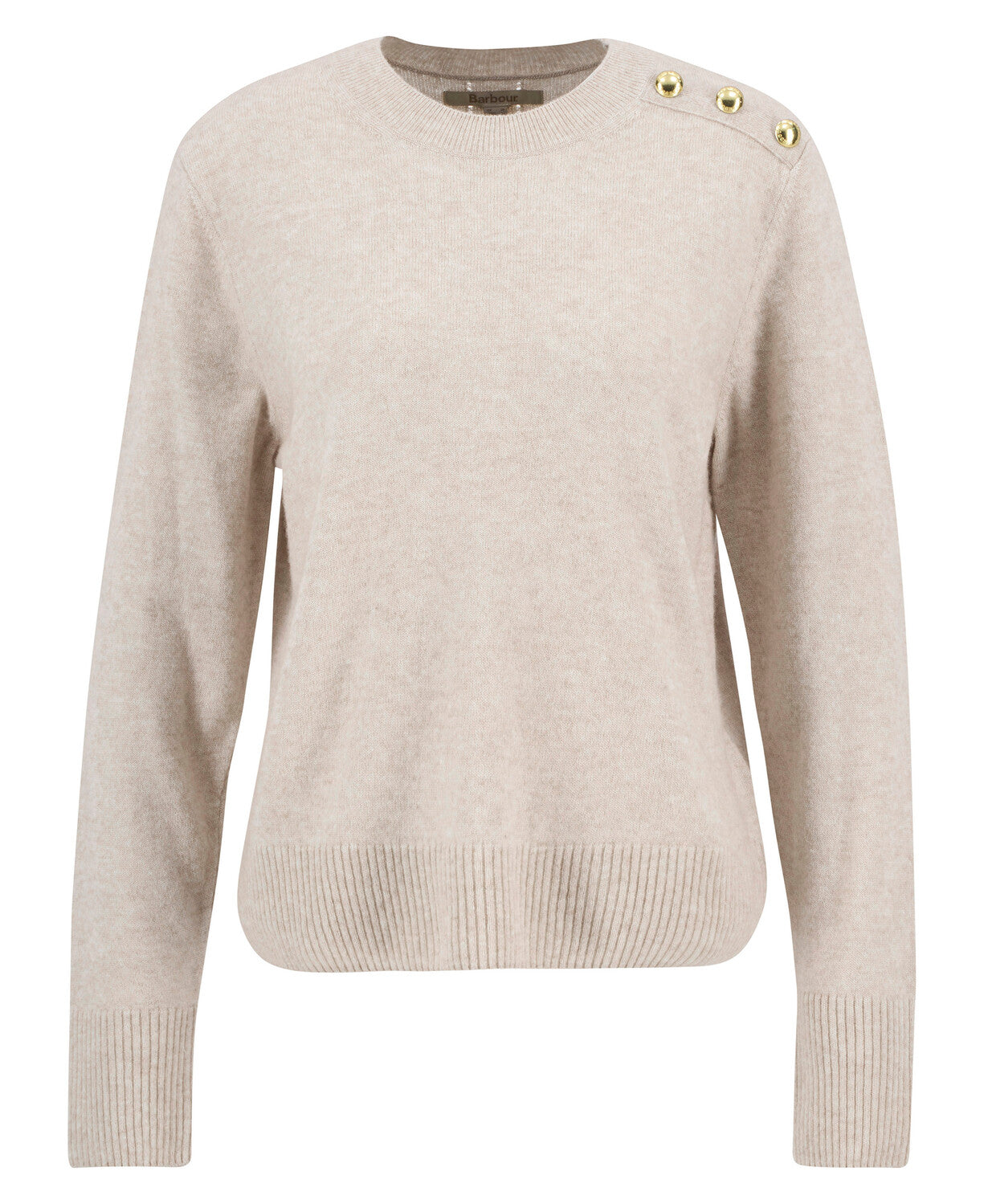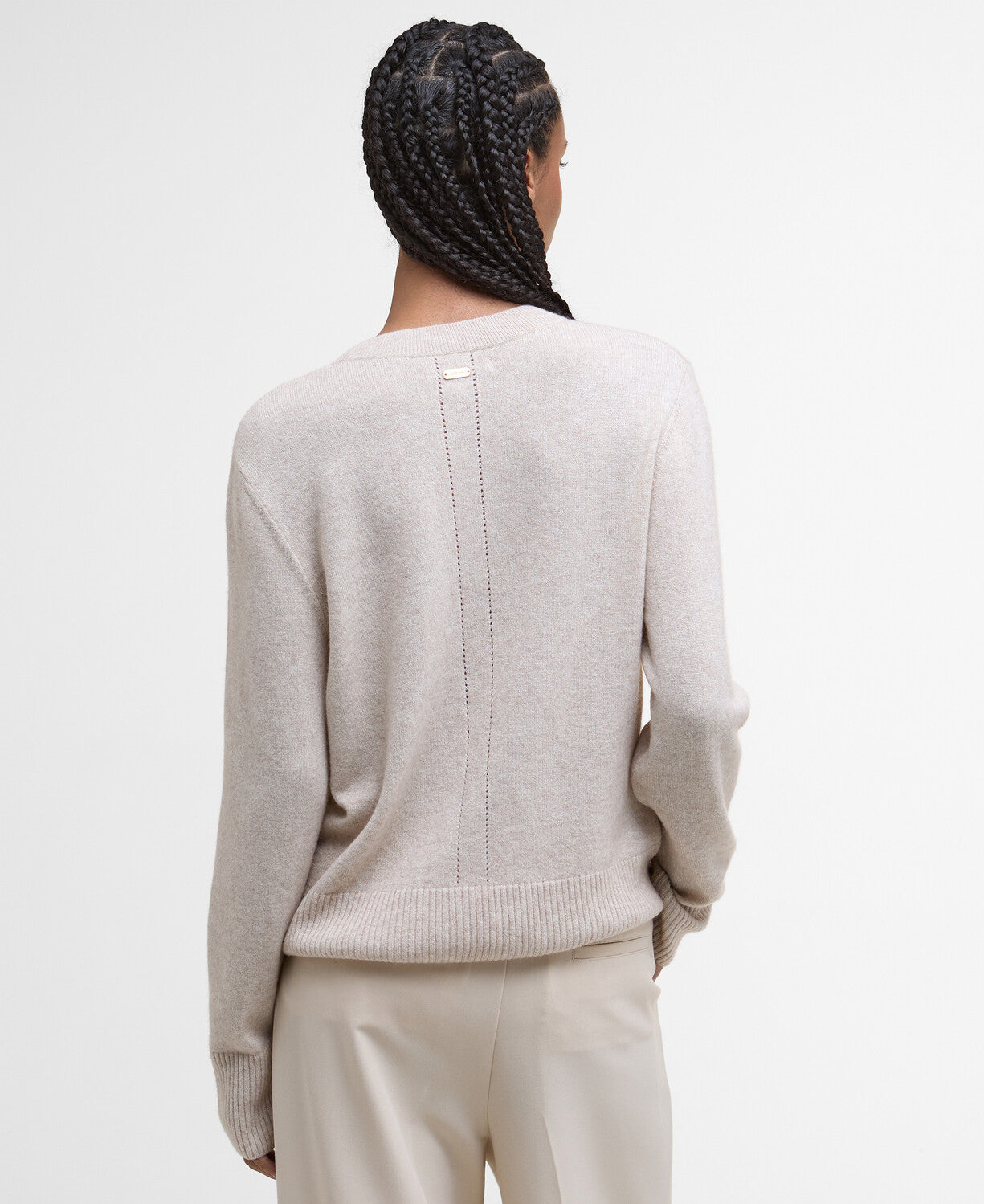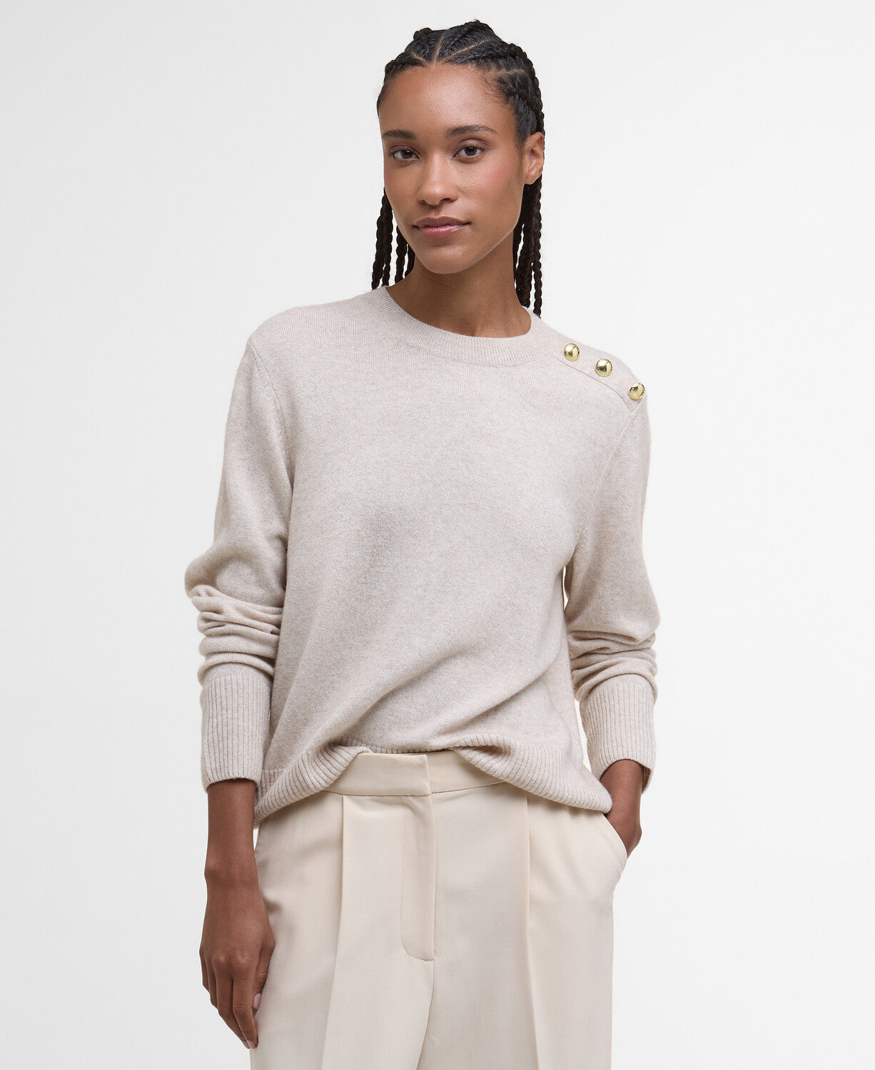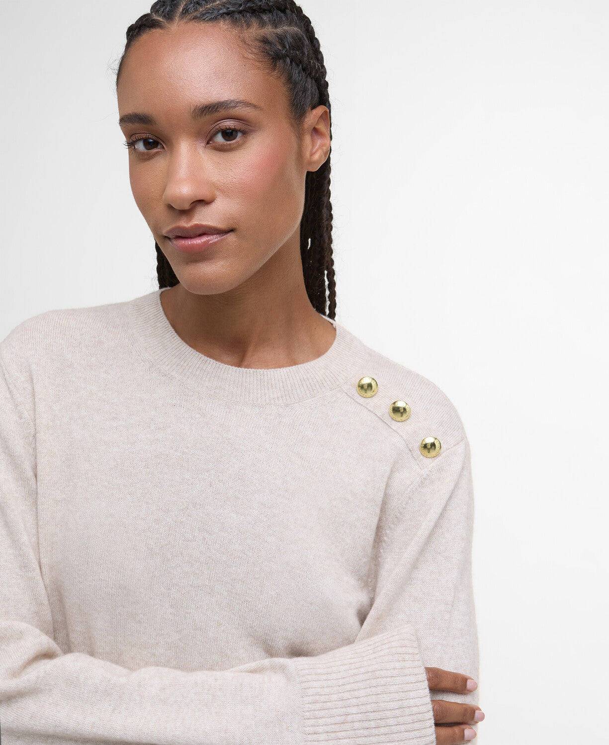 Experience timeless style and comfort with the Barbour Eleanor Knitted Jumper in Oat. Crafted from a soft wool-blend knit, it offers a relaxed fit and thoughtful details like ribbed trims and set-in sleeves for effortless wearability. The mock placket with branded buttons adds a touch of distinctive charm at the shoulder, while the subtle pointelle stripe down the back elevates the design with an elegant finish. Perfect for layering or wearing on its own, this jumper brings both warmth and sophistication to your wardrobe.