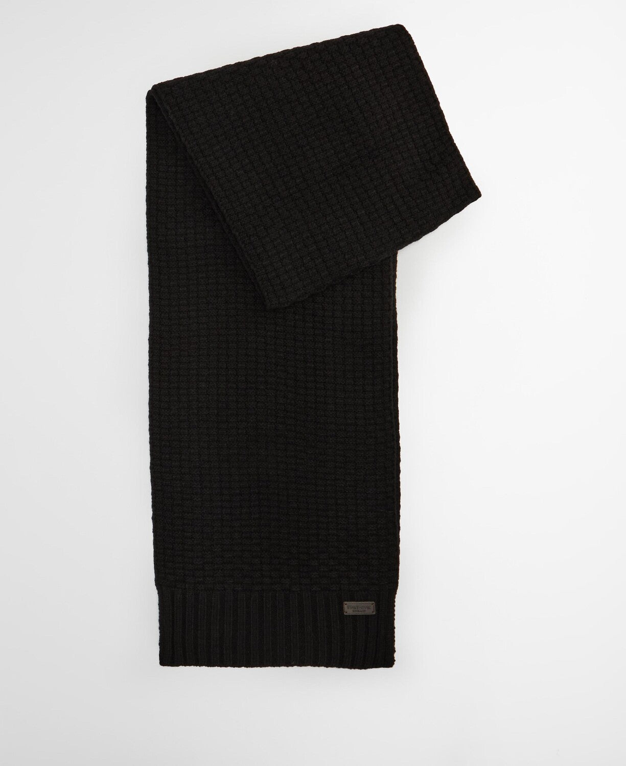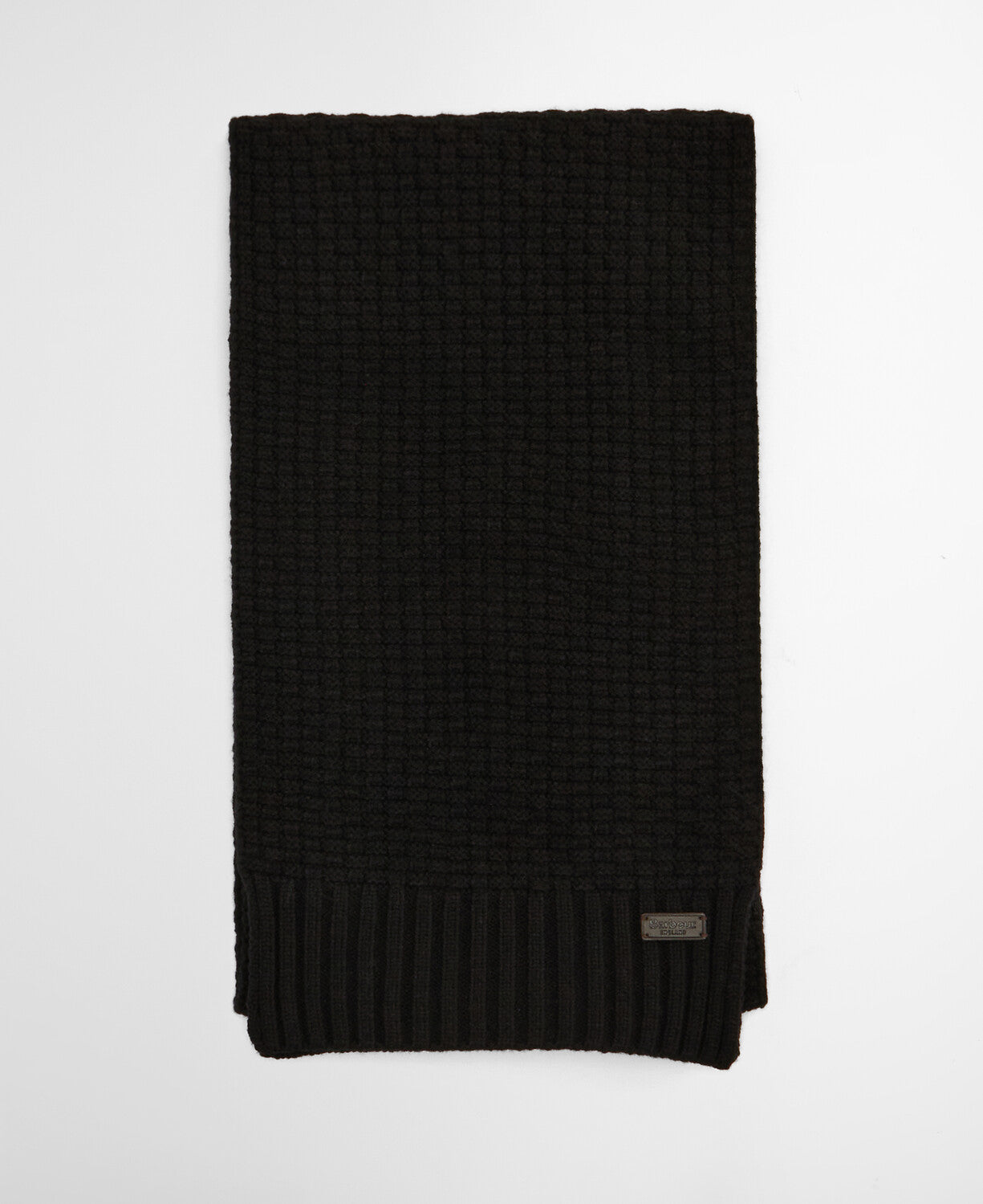 Beanie: Branded Barbour tab to wearer's left hand side. Scarf: Barbour branded tab to bottom right hand corner.