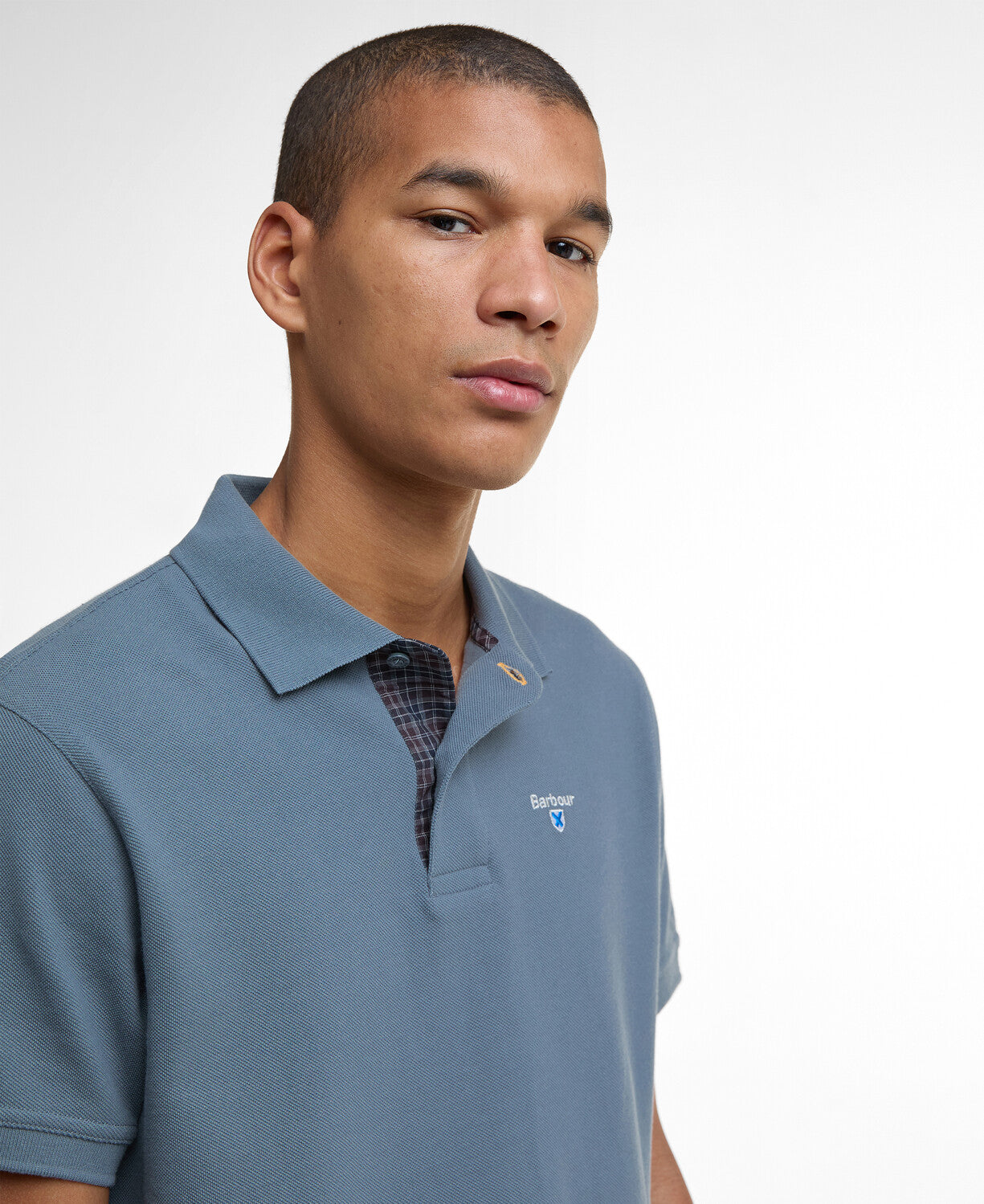 Elevate your casual style with the Barbour Tartan Pique Polo Shirt in Blue Stone. Crafted from 100% cotton, this comfortable short-sleeve shirt features a distinctive tartan trim at the back neck and subtle branding on the chest. Perfectly paired with jeans or tracksuits, it brings a timeless British design to your everyday wardrobe. Enjoy lasting quality and effortless style with this versatile essential.