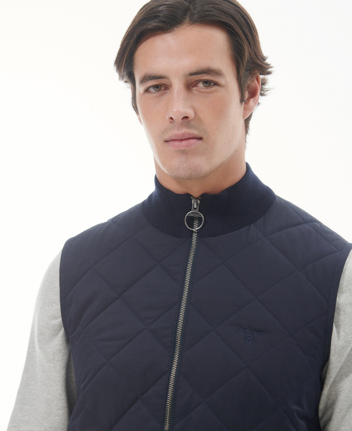 Barbour and Shield embroidery to the wearers left chest.