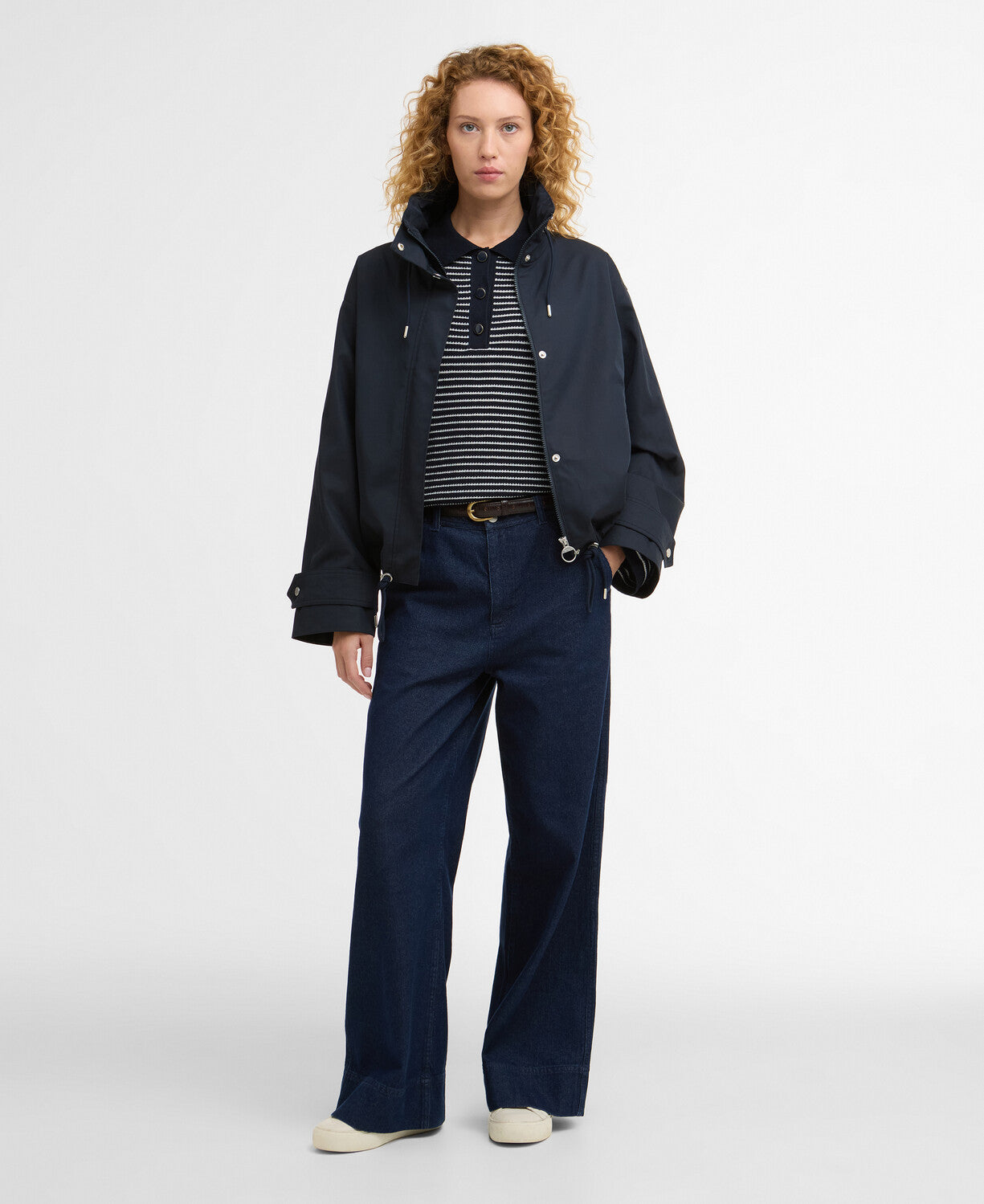 The Barbour Bronwyn Showerproof Jacket in Dark Navy delivers effortless style when weather turns unpredictable. Its oversized funnel neck and adjustable drawcords at the neck and hem let you customise your fit for maximum comfort and protection. Behind the studded placket, a smooth zip fastening provides reliable closure, whilst practical front welt pockets keep essentials within reach. Lightweight yet built to last, this short-layered jacket seamlessly transitions between seasons, blending contemporary design with Barbour's iconic heritage craftsmanship for a versatile wardrobe staple.